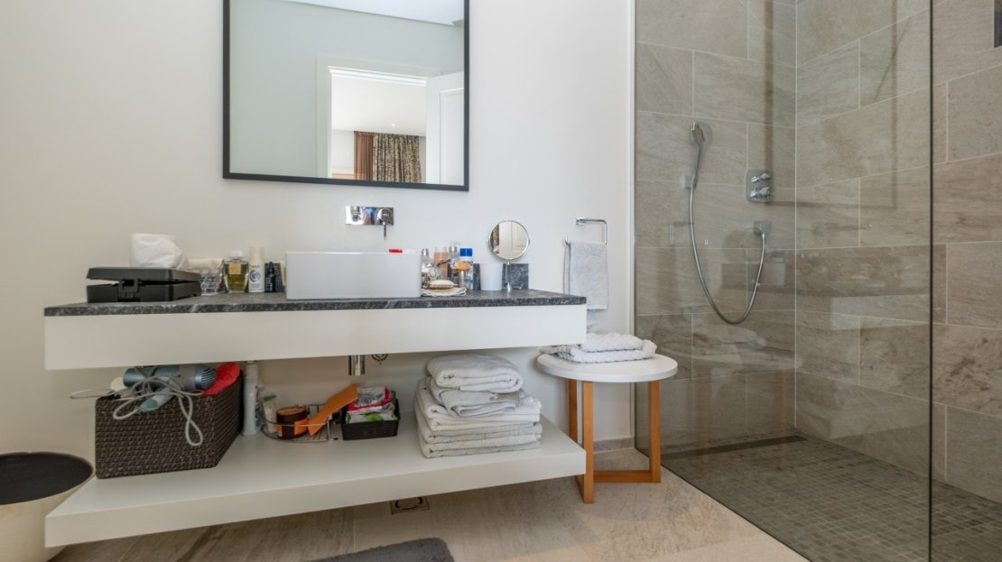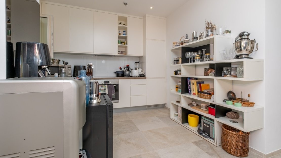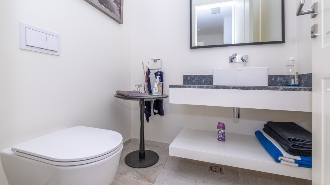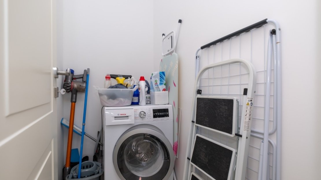 The layout of the apartment includes two spacious bedrooms, each with en-suite bathroom, providing maximum privacy and comfort. Additionally, the apartment features one toilet and a room used as a laundry or storage area, adding to the practicality of everyday living.
