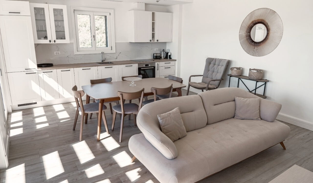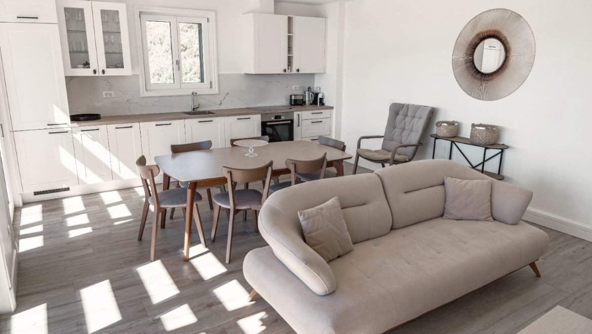 Interiors are bright and minimalist, offering high-end finishes and natural materials for a serene, comfortable atmosphere. Thanks to its optimal orientation, the apartment is awash with sunlight all day; the terrace is ideal for morning coffee with sunrise views or relaxing evenings watching the sun set over the Adriatic.​