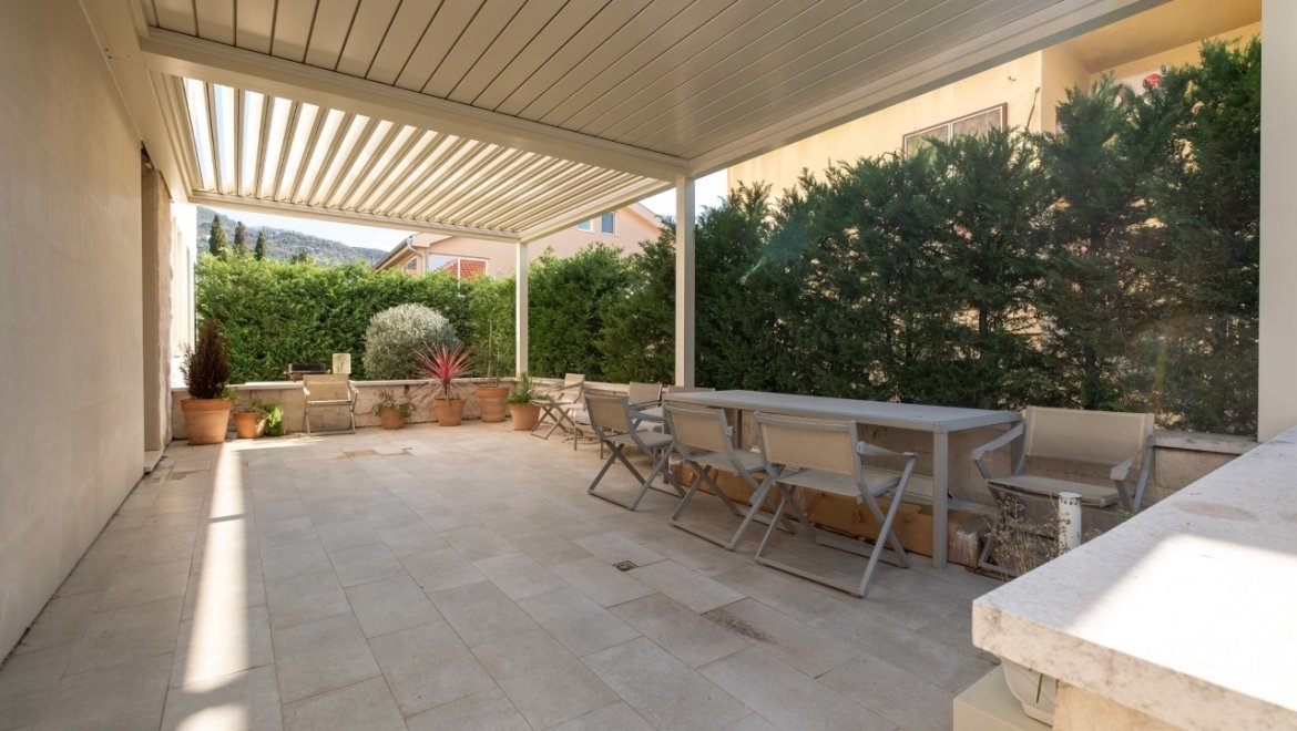 Дополнительно, в квартире есть просторная терраса 24 кв.м, оборудованная для круглогодичного отдыха: установлена биоклиматическая пергола с атмосферной LED-подсветкой и декингом.